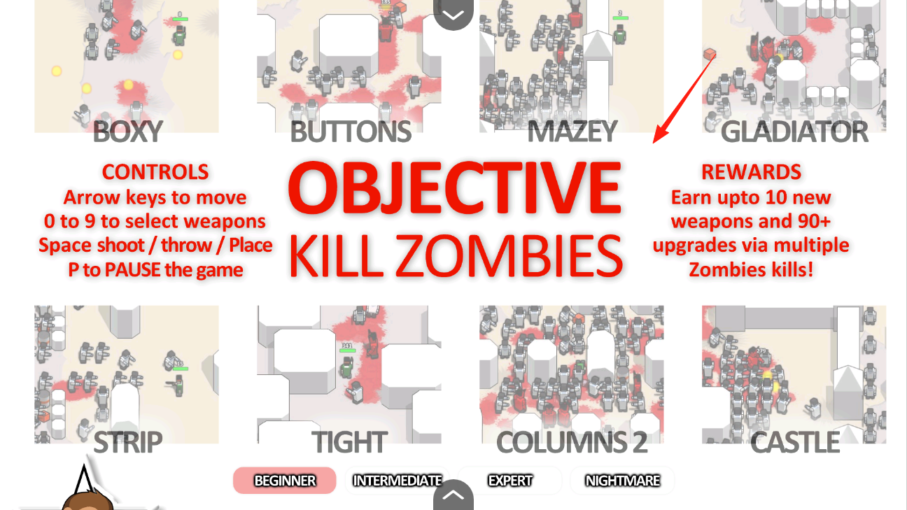2、BOXY模式適合新手練手,MAZEY迷宮則考驗走位技巧,不同模式僵尸刷新方式都不一樣,用數(shù)字鍵快速切換武器,空格鍵不僅能射擊還能投擲道具,記得根據(jù)右上角難度量力而行。