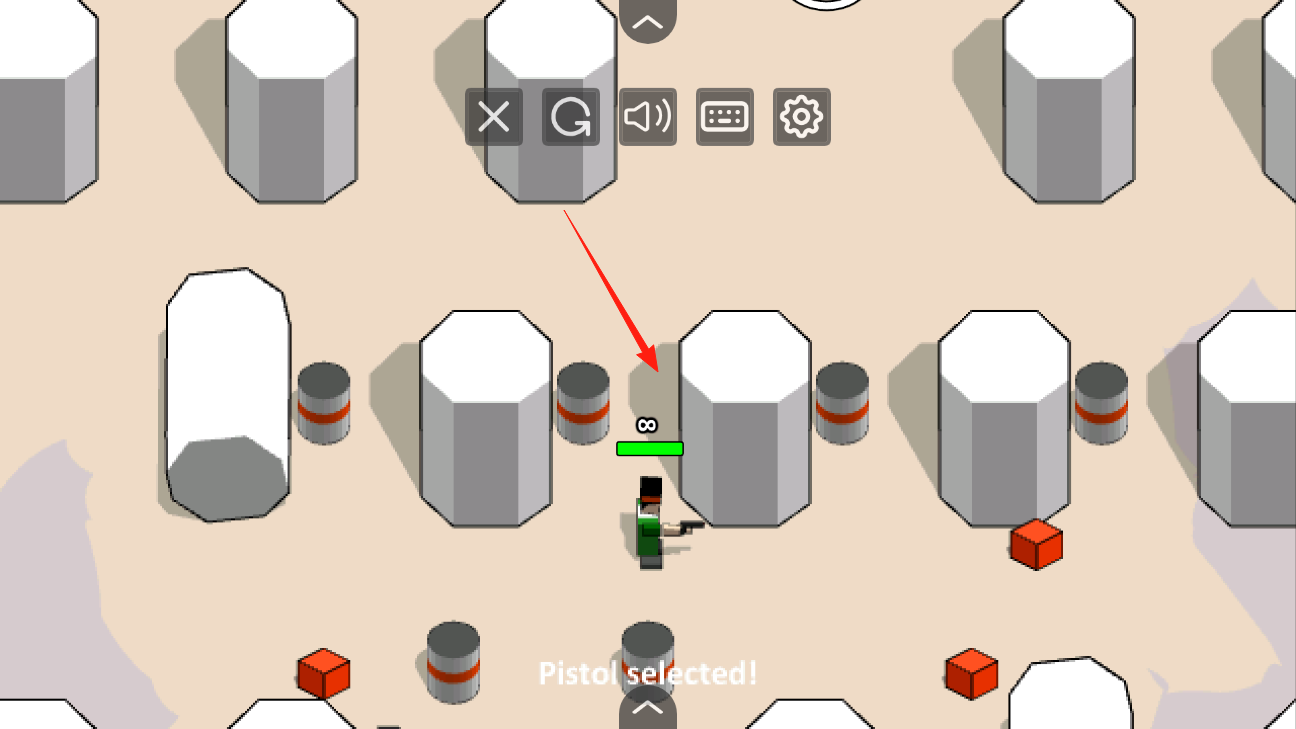 3、手槍選中時會有提示,六邊形柱子是天然掩體,躲后面能避開僵尸攻擊,綠色血條上方的眼睛圖標(biāo)會預(yù)警危險,紅圈油桶被打爆能造成范圍傷害,走位時好好利用這些地形。