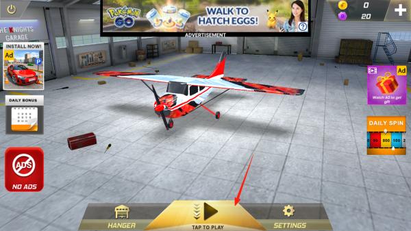 1、進(jìn)入游戲車(chē)庫(kù)界面,中間停著一架花里胡哨的小飛機(jī),想開(kāi)始飛行,點(diǎn)下方TAP TO PLAY按鈕,就能操控飛機(jī)起飛,在天空里自由翱翔,還能做些特技動(dòng)作。