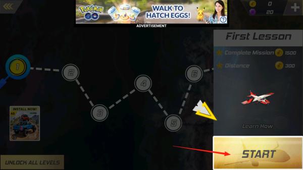 3、進(jìn)入關(guān)卡選擇界面,能看到關(guān)卡是按順序連接的,選第一關(guān)First Lesson,這關(guān)是入門(mén)教學(xué),點(diǎn)START開(kāi)始,跟著提示學(xué)習(xí)開(kāi)飛機(jī)的基本操作。