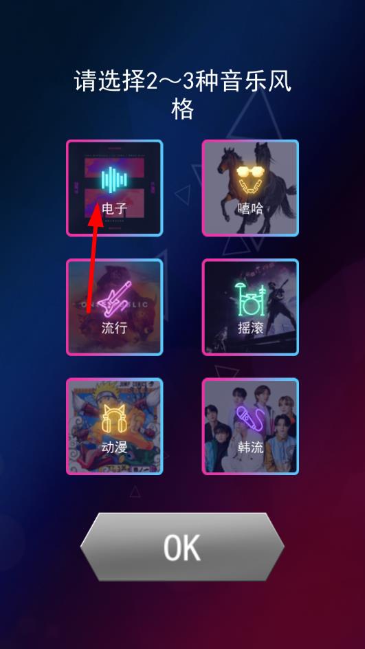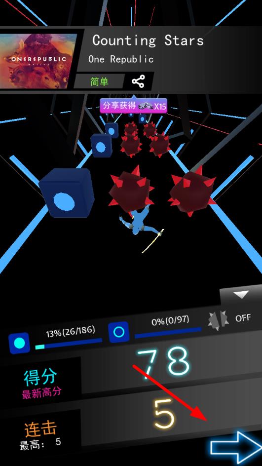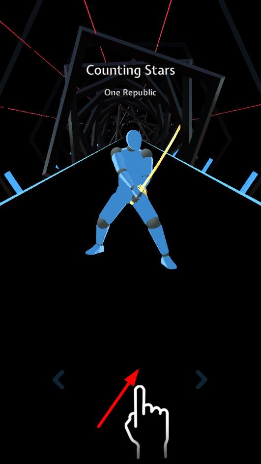 1、進(jìn)入游戲后選擇喜歡的音樂(lè)曲目,在賽博朋克風(fēng)格的賽道上,通過(guò)左右滑動(dòng)屏幕控制角色揮舞光劍,熟悉劈砍方塊的基礎(chǔ)操作。