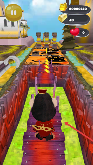 2、在跑酷場(chǎng)景中,滑動(dòng)屏幕操控角色,讓角色在木橋等路徑上跳躍,避開(kāi)陷阱,持續(xù)向前沖刺。