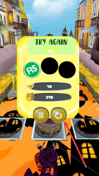 3、挑戰(zhàn)失敗后,在TRY-AGAIN界面,點(diǎn)擊重新開(kāi)始按鈕,利用獲得的40金條和240獎(jiǎng)勵(lì),再度嘗試通關(guān)。