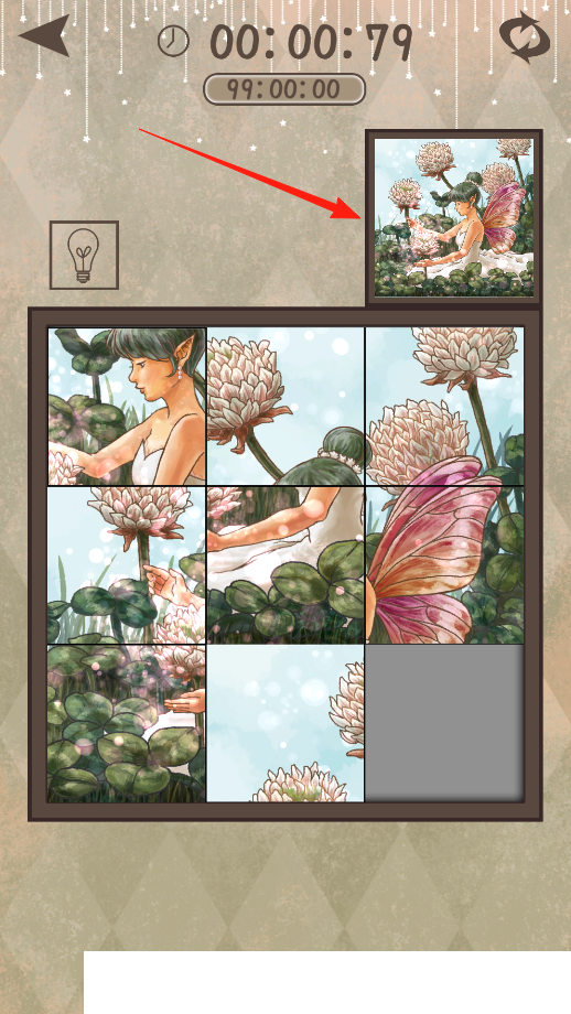 2、上方計(jì)時(shí)器顯示當(dāng)前用時(shí)79秒,總時(shí)長99分鐘可以慢慢思考,右上角小圖是完整參考,覺得困難時(shí)可以用左上角的提示功能。