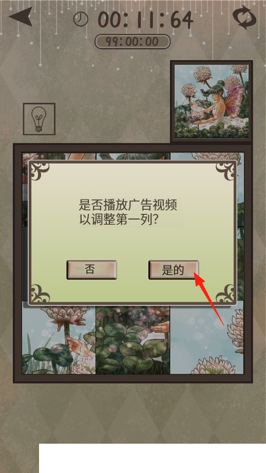 3、系統(tǒng)詢問是否觀看廣告來調(diào)整第一列拼圖,建議選是的獲取幫助,倒計(jì)時(shí)還剩11秒多,時(shí)間充??梢宰屑?xì)考慮是否使用提示。