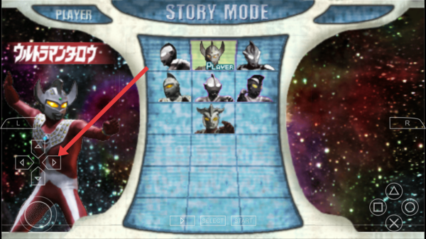 2、進(jìn)入故事模式選角界面,操控左側(cè)方向鍵移動(dòng)光標(biāo),選定泰羅奧特曼,為后續(xù)劇情戰(zhàn)斗與故事推進(jìn)做好角色準(zhǔn)備。