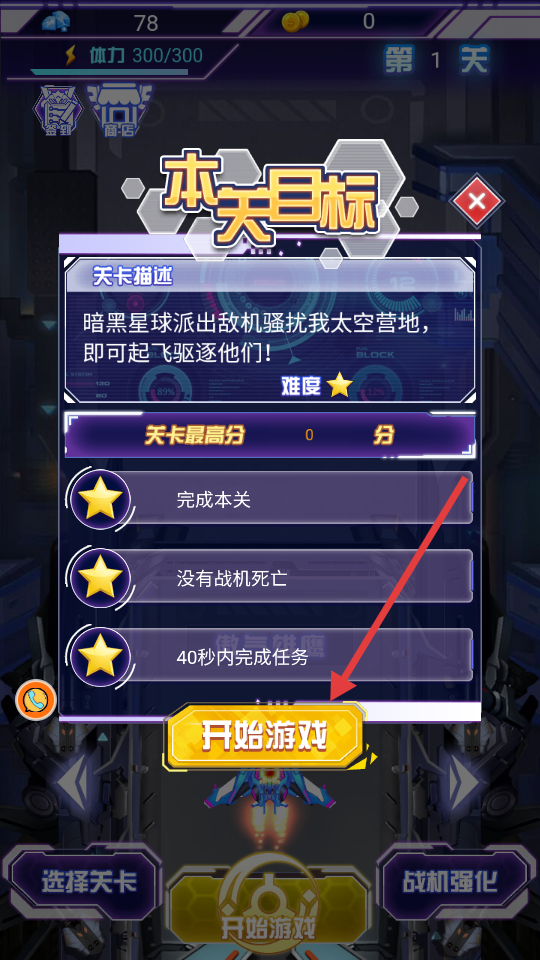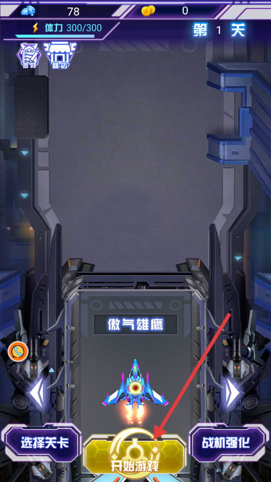 1、從機庫選擇初始戰(zhàn)機,通過金幣解鎖隱藏型號或升級武器系統(tǒng)。