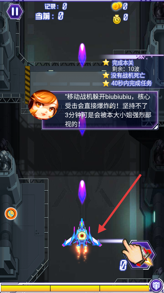 2、單指滑動控制戰(zhàn)機移動,雙指點擊釋放核彈清屏技能扭轉(zhuǎn)戰(zhàn)局。