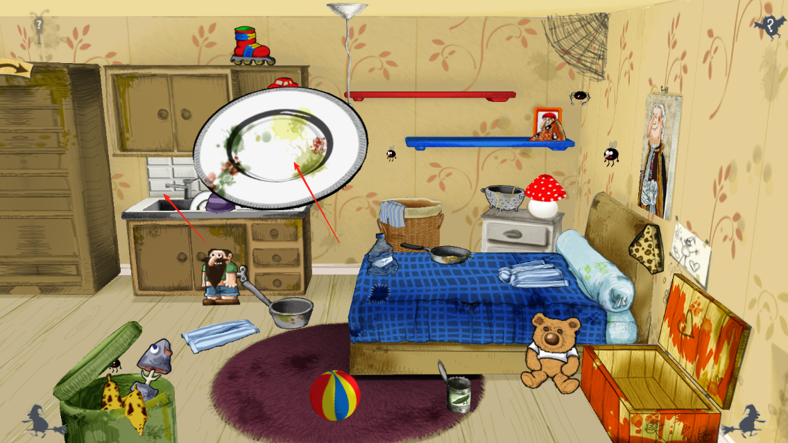 3、在雜亂房間場景,點擊、拖拽臟盤子到碗池里,將垃圾丟到最下交的垃圾桶里,將這個房間清理干凈。