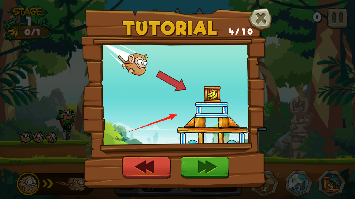 2、教程到第四部分啦,猴子被彈弓發(fā)射出去后,要朝著有香蕉的結(jié)構飛去,控制好猴子的飛行軌跡,讓它撞到那個結(jié)構,這樣就能拿到香蕉,完成這一步的教程任務。