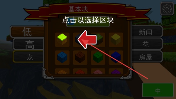 3、建造環(huán)節(jié),在基本塊界面,按提示點(diǎn)擊以選擇區(qū)塊,挑選不同顏色、類型方塊,用于搭建場景、創(chuàng)造建筑推進(jìn)游戲。