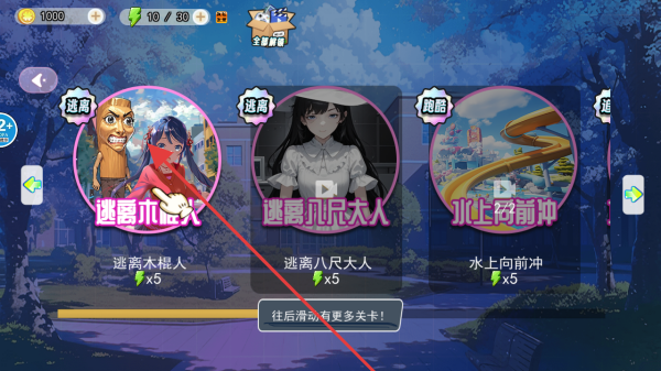 2、進(jìn)入關(guān)卡選擇,選逃離木棍人等關(guān)卡如逃離類、跑酷類,點(diǎn)擊對(duì)應(yīng)關(guān)卡圖標(biāo),進(jìn)入該關(guān)卡的游戲挑戰(zhàn)。