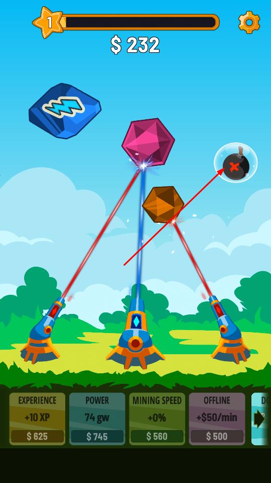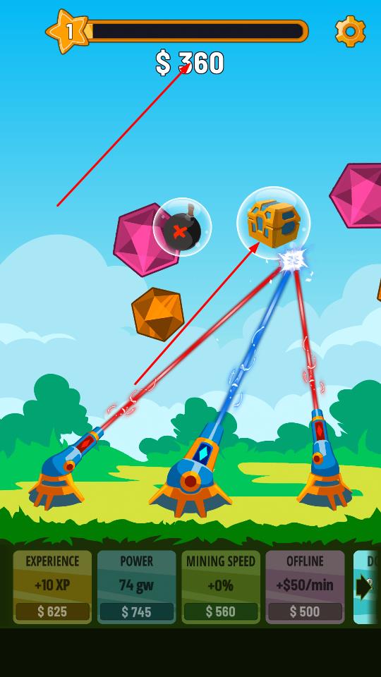 3、持續(xù)射擊寶石刷新金錢,推進頂部星級進度條等級1及進度,解鎖更高級炮臺與稀有寶石,循環(huán)升級與收集,沖擊更高金錢收益與關(guān)卡進度。