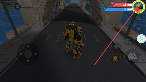 1、進(jìn)入游戲操控變形金剛諾瓦爾,通過(guò)左側(cè)搖桿移動(dòng),右側(cè)按鍵攻擊,點(diǎn)擊右上角角色頭像,可查看狀態(tài)或切換功能。