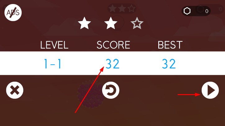 3、關(guān)卡結(jié)束看得分、星級,點箭頭按鈕繼續(xù)挑戰(zhàn)。