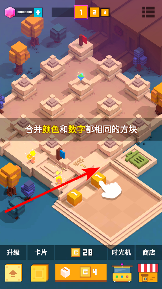 2、遇到顏色和數(shù)字均相同的方塊,將它們合并在一起,提升方塊的等級,合并過程遵循界面提示,確保操作有效,積累更優(yōu)質(zhì)的方塊。
