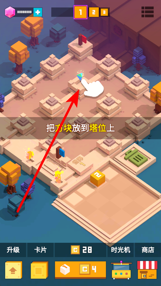 3、完成方塊合并后,按照指引把方塊放置到塔位上,依據(jù)場景布局與塔位的需求合理安排,構(gòu)建防御或增益的體系,推動關(guān)卡進程。