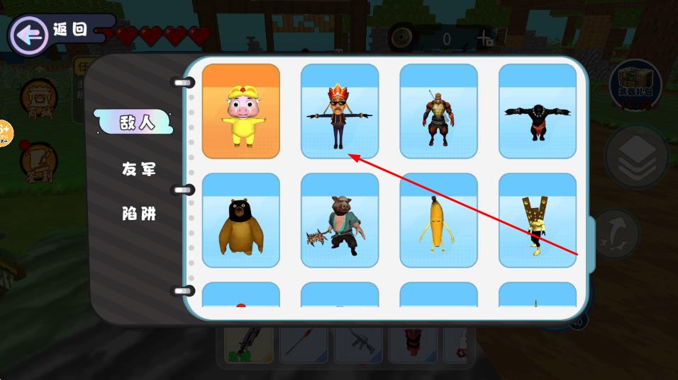 3、進(jìn)入創(chuàng)造界面,在敵人分類下,點擊選中角色,將其添加到游戲場景,助力完成任務(wù)如擊敗指定敵人。