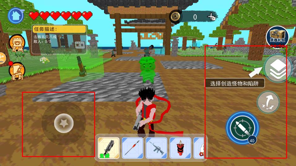 2、在游戲場景中,左側(cè)虛擬搖桿控制角色移動,右側(cè)可點擊選擇創(chuàng)造怪物和陷阱等按鈕,調(diào)用對應(yīng)功能。