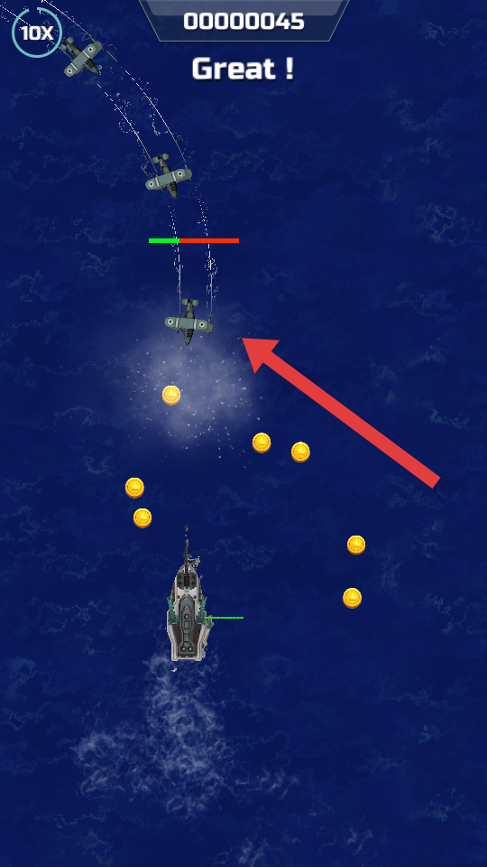 2、遇多架敵機,保持艦艇移動滑動屏幕調(diào)整位置,讓射擊線覆蓋敵機,觸發(fā)Great連擊,收集掉落金幣。