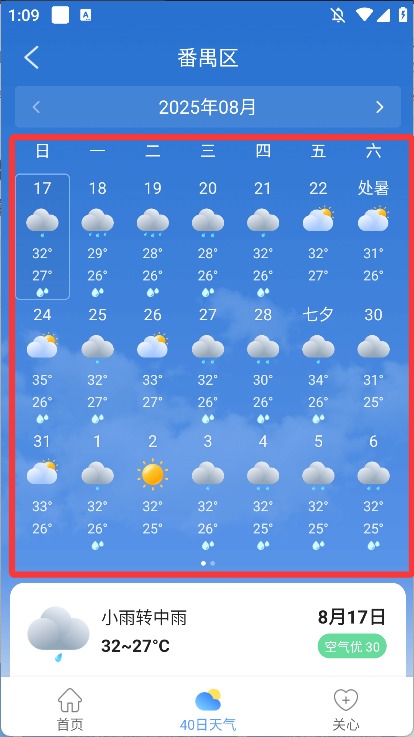 4、選擇完成后就可以在主頁看到近半個月內(nèi)的天氣了。
