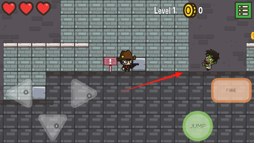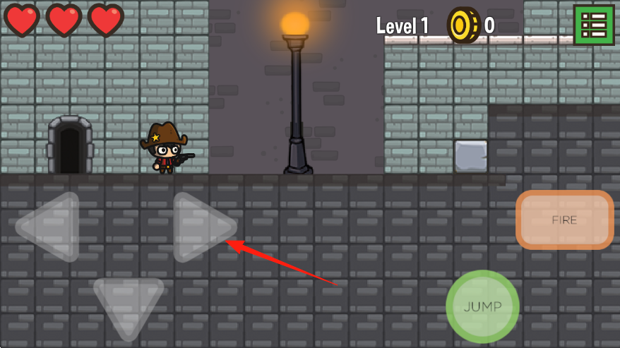 1、點(diǎn)擊屏幕左下方的方向鍵如紅箭頭所指,控制牛仔角色左右移動(dòng),探索關(guān)卡場景。