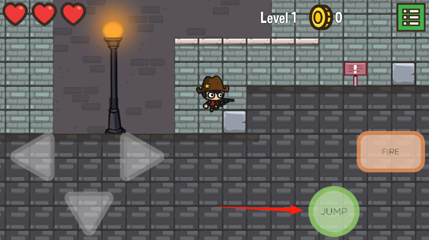 2、遇到障礙物或需要到達(dá)更高位置時(shí),點(diǎn)擊屏幕右下方的JUMP按鈕如紅箭頭指示,讓角色跳躍。