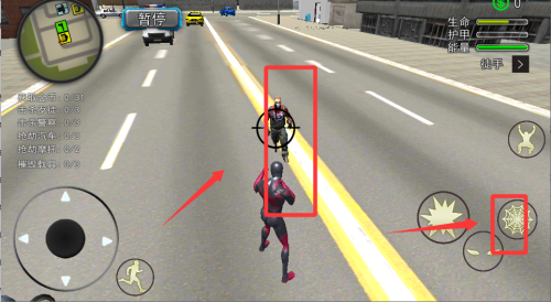 1、進入游戲后先熟悉蜘蛛俠的移動操作,利用蛛絲在高樓間擺蕩,快速到達任務(wù)地點,節(jié)省趕路時間。