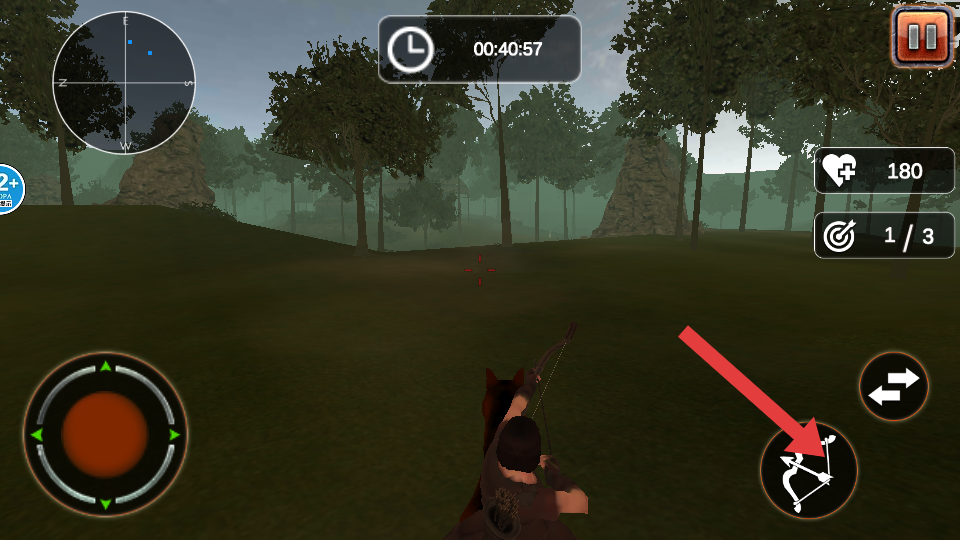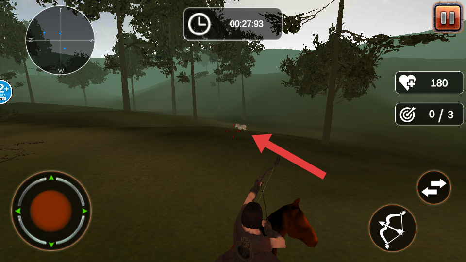 1、騎乘馬匹時(shí),用左側(cè)搖桿速移,鎖定地圖獵物如羊,點(diǎn)擊右側(cè)弓箭按鈕射擊,優(yōu)先完成狩獵目標(biāo)。