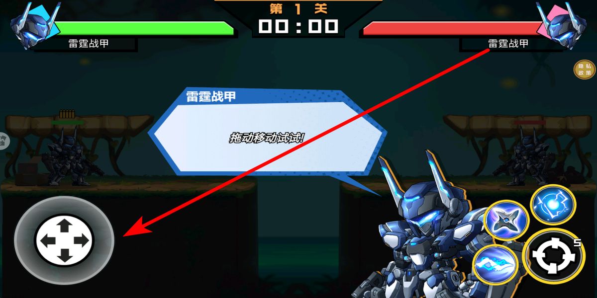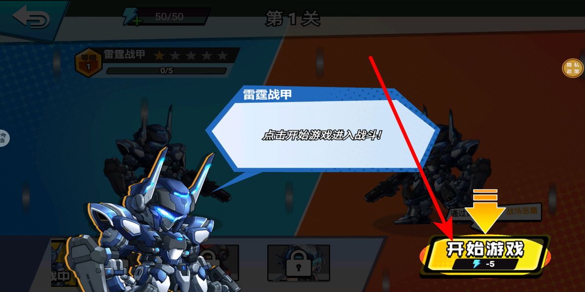 1、進(jìn)入主界面,點(diǎn)擊開始游戲消耗5點(diǎn)能量,選定關(guān)卡后加載戰(zhàn)場(chǎng),查看機(jī)甲等級(jí)、血量等信息,跟隨提示熟悉搖桿移動(dòng)操作,為對(duì)戰(zhàn)做好籌備。