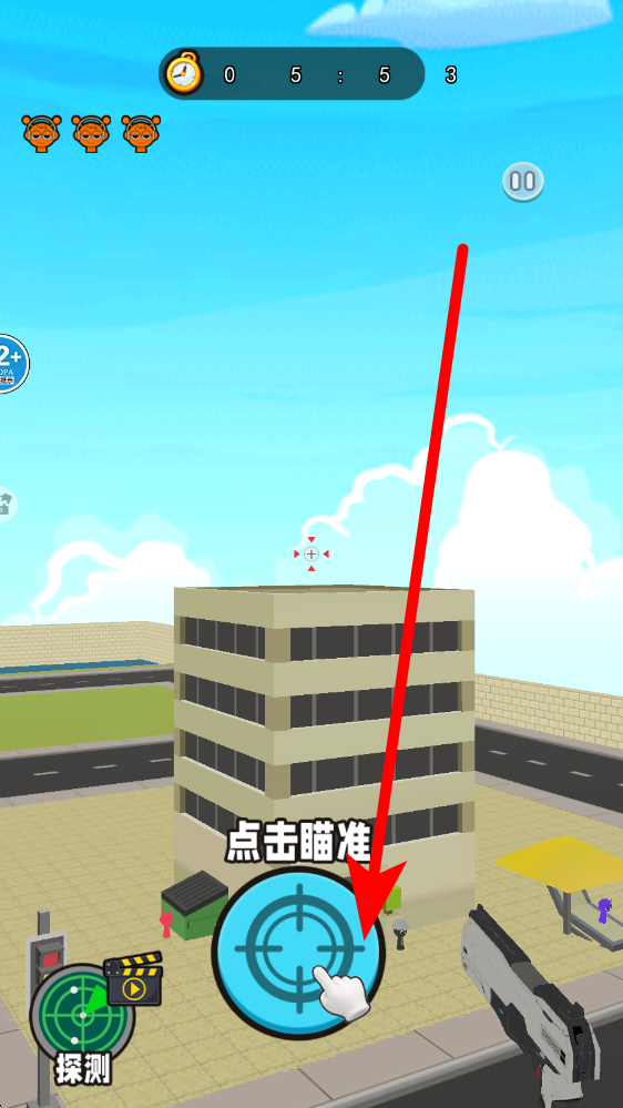 2、戰(zhàn)斗時(shí)點(diǎn)擊屏幕瞄準(zhǔn)按鈕,激活瞄準(zhǔn)視角,滑動(dòng)屏幕控制鏡頭移動(dòng),搜尋場(chǎng)景中隱藏的敵人目標(biāo),鎖定其位置,規(guī)劃射擊角度。