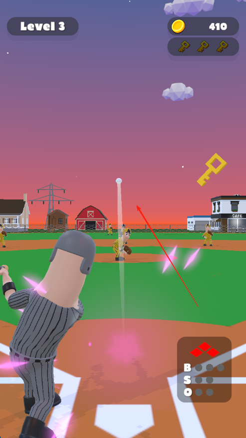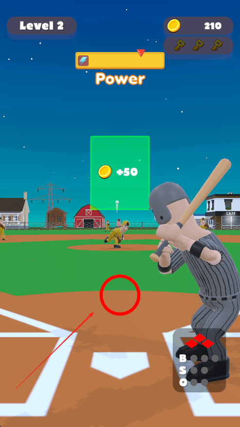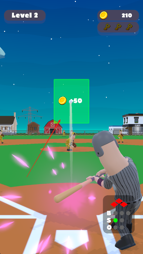 2、當(dāng)投手投球過來時(shí),通過屏幕右下角的方向鍵控制角色揮棒方向,在合適時(shí)機(jī)點(diǎn)擊按鍵進(jìn)行擊球,將球擊打到帶有金幣標(biāo)識(shí)的區(qū)域獲取金幣。
