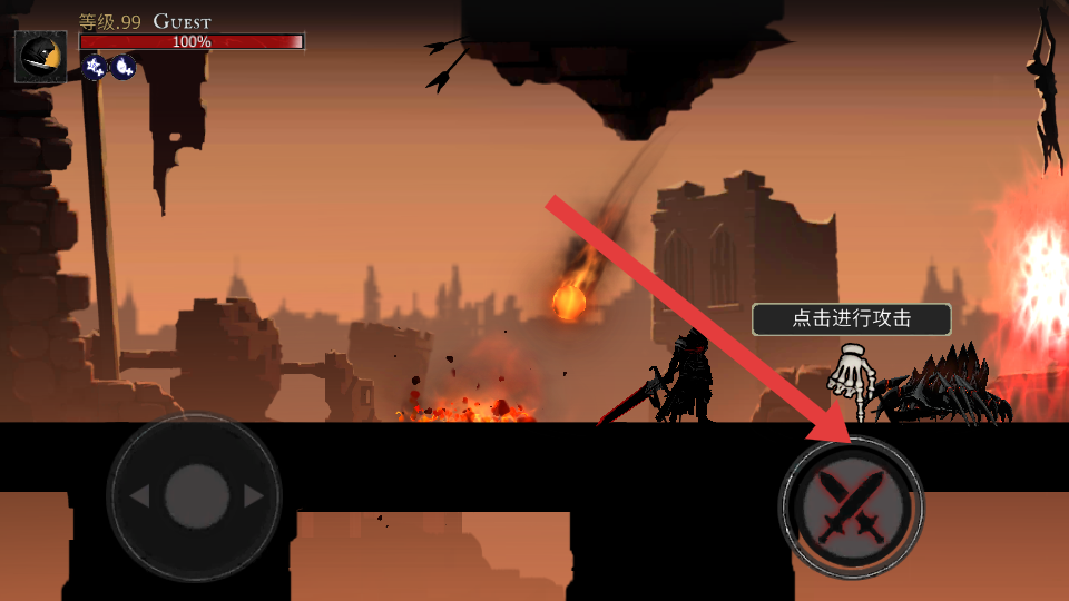 2、游戲中跟隨殺死所有敵人任務(wù)指引,遇到怪物時(shí)點(diǎn)擊攻擊按鈕連招,注意躲避場(chǎng)景陷阱如火焰。