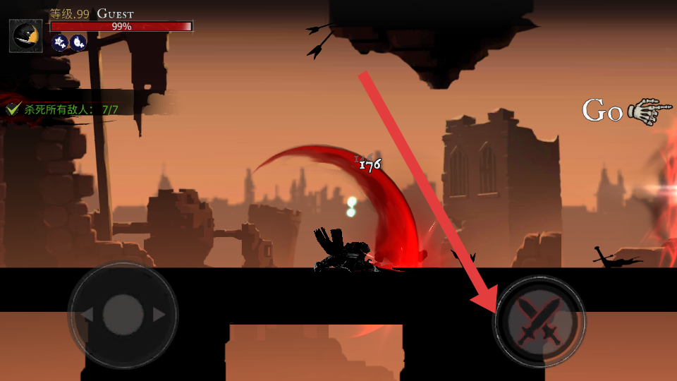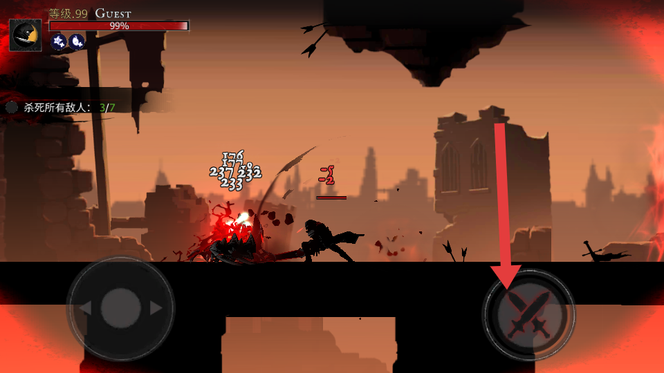1、進(jìn)入游戲界面后,用左側(cè)搖桿控制角色移動(dòng),熟悉點(diǎn)擊進(jìn)行攻擊按鈕右側(cè)雙刀圖標(biāo),這是戰(zhàn)斗操作。