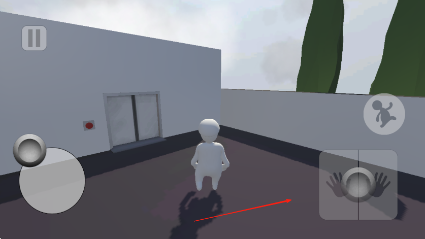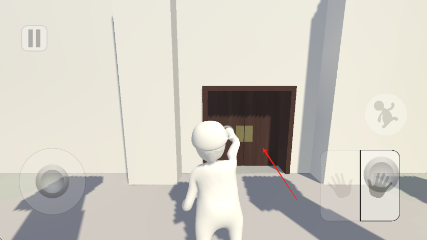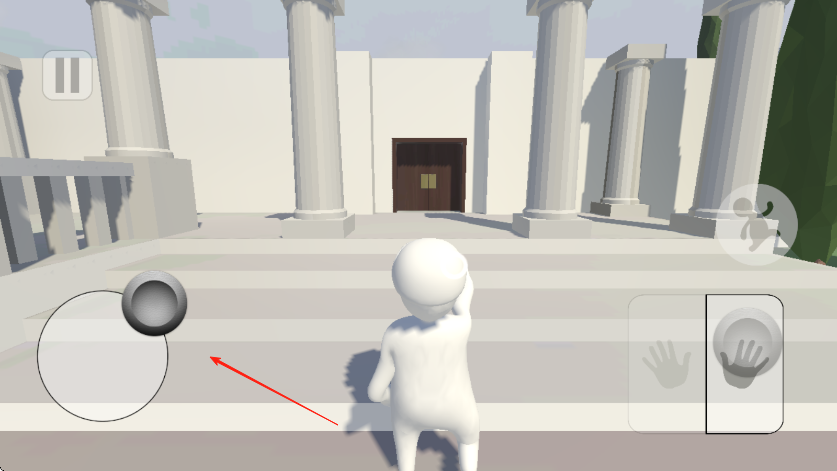1、進(jìn)入游戲,通過(guò)左下角虛擬搖桿控制白色小人移動(dòng),朝著前方有立柱和木門(mén)的建筑前進(jìn),熟悉移動(dòng)操作。