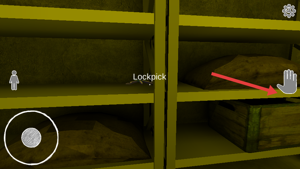 1、用搖桿移動(dòng),先探索場(chǎng)景,在黃色的架子找到Lockpick開鎖器,點(diǎn)擊手型的按鈕進(jìn)行拾取。
