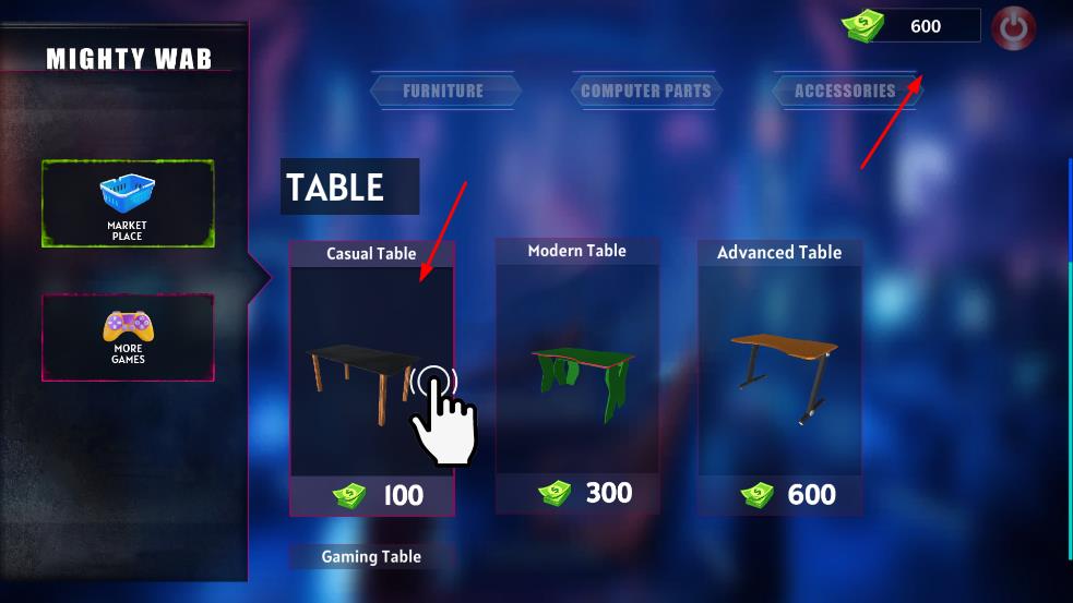 1、進(jìn)入MARKET PLACE,用金幣購(gòu)買家具桌子/椅子、電腦配件,布置網(wǎng)吧場(chǎng)景。