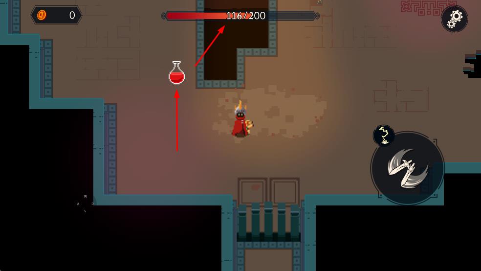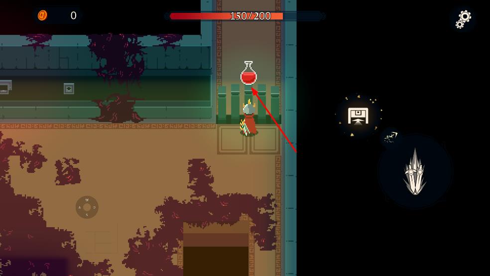 1、資源收集探索墓室,拾取紅色藥瓶恢復(fù)血量,維持生存。
