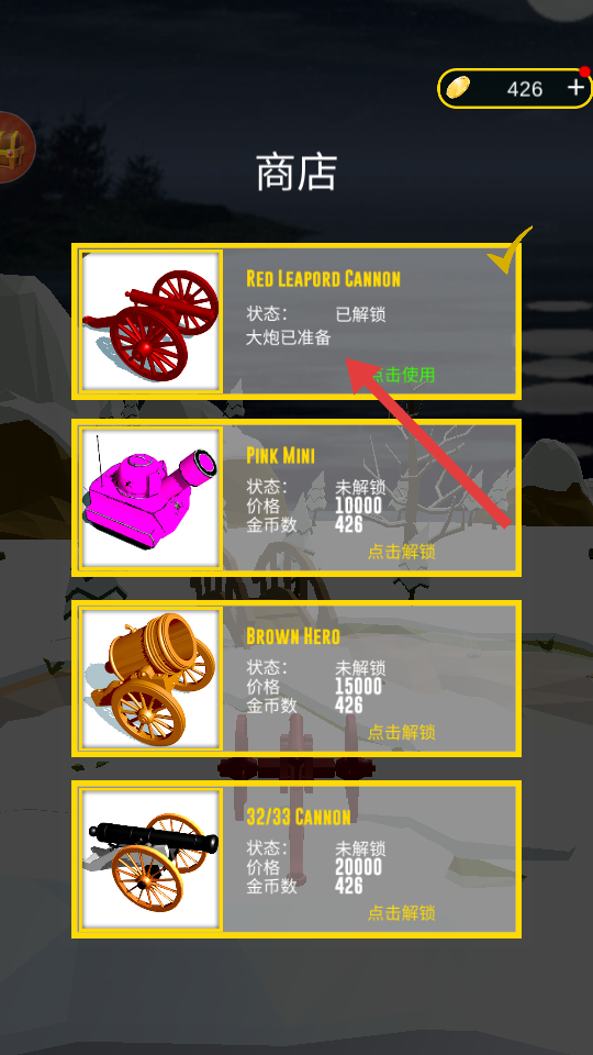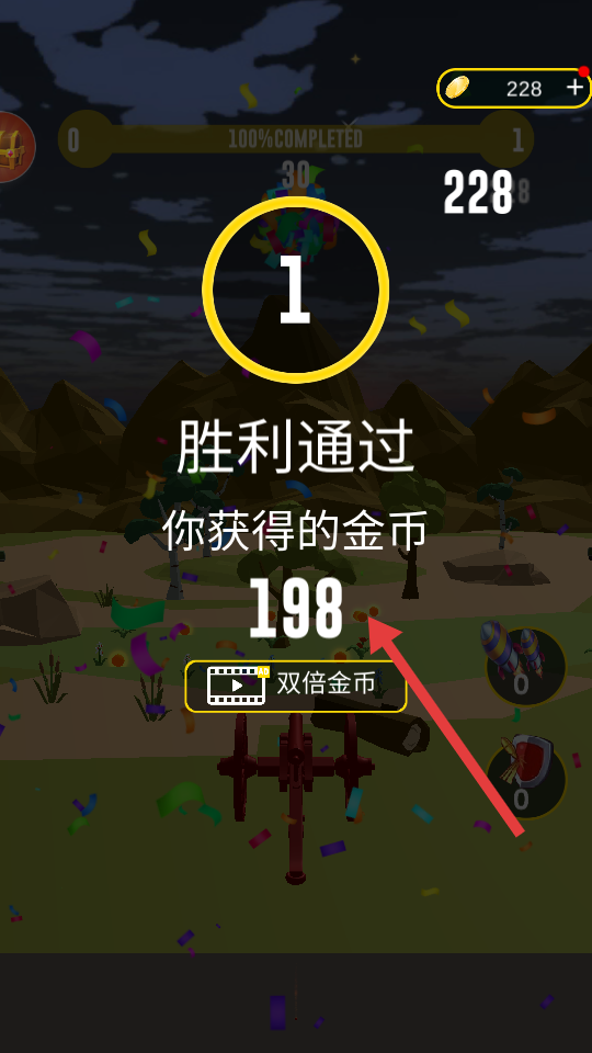 3、通關時需清空當前關卡所有敵人,結算時根據(jù)消滅敵人數(shù)量與用時獲取金幣,用金幣解鎖高級大炮或彈藥后,即可開啟下一關挑戰(zhàn)。
