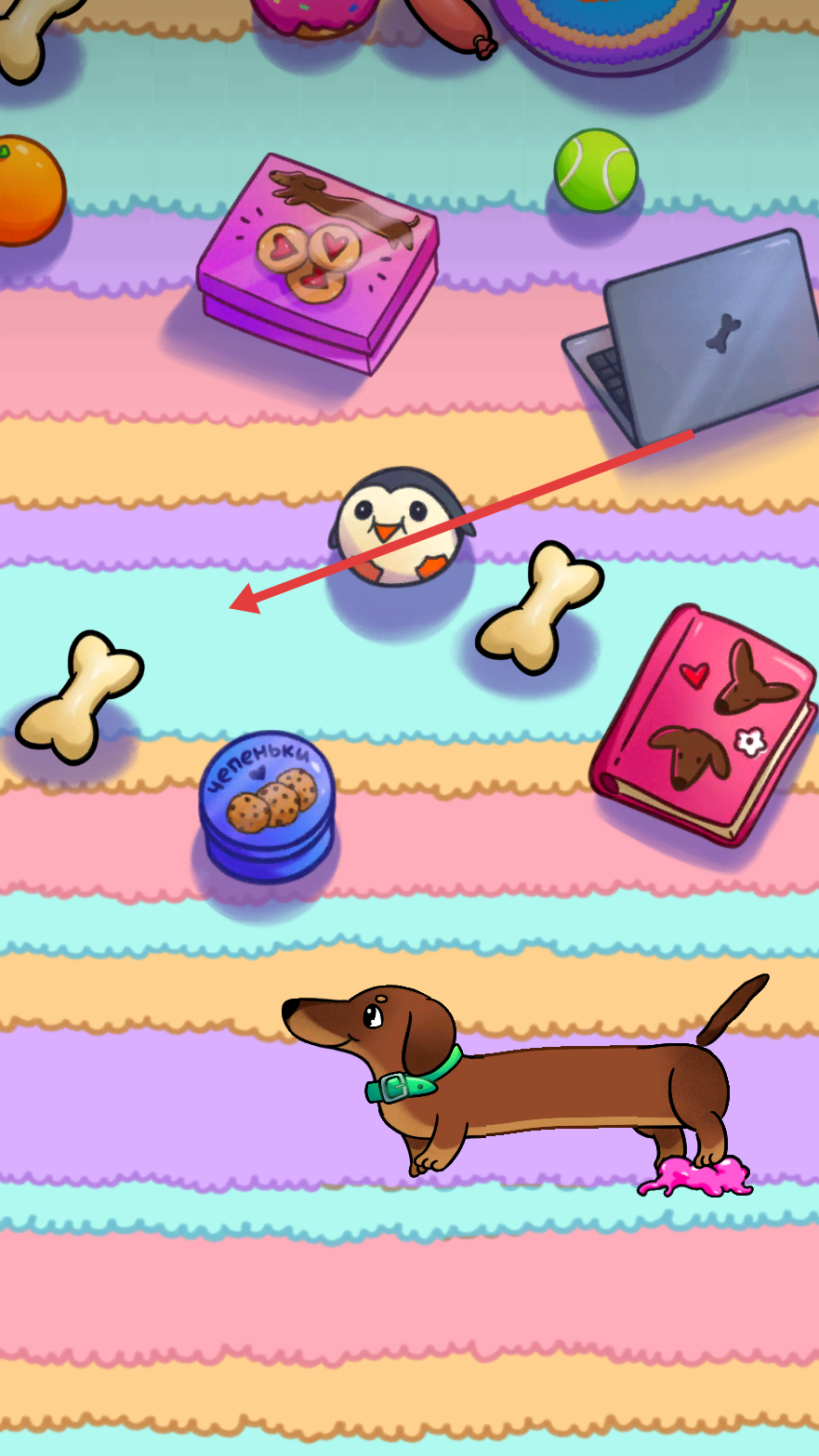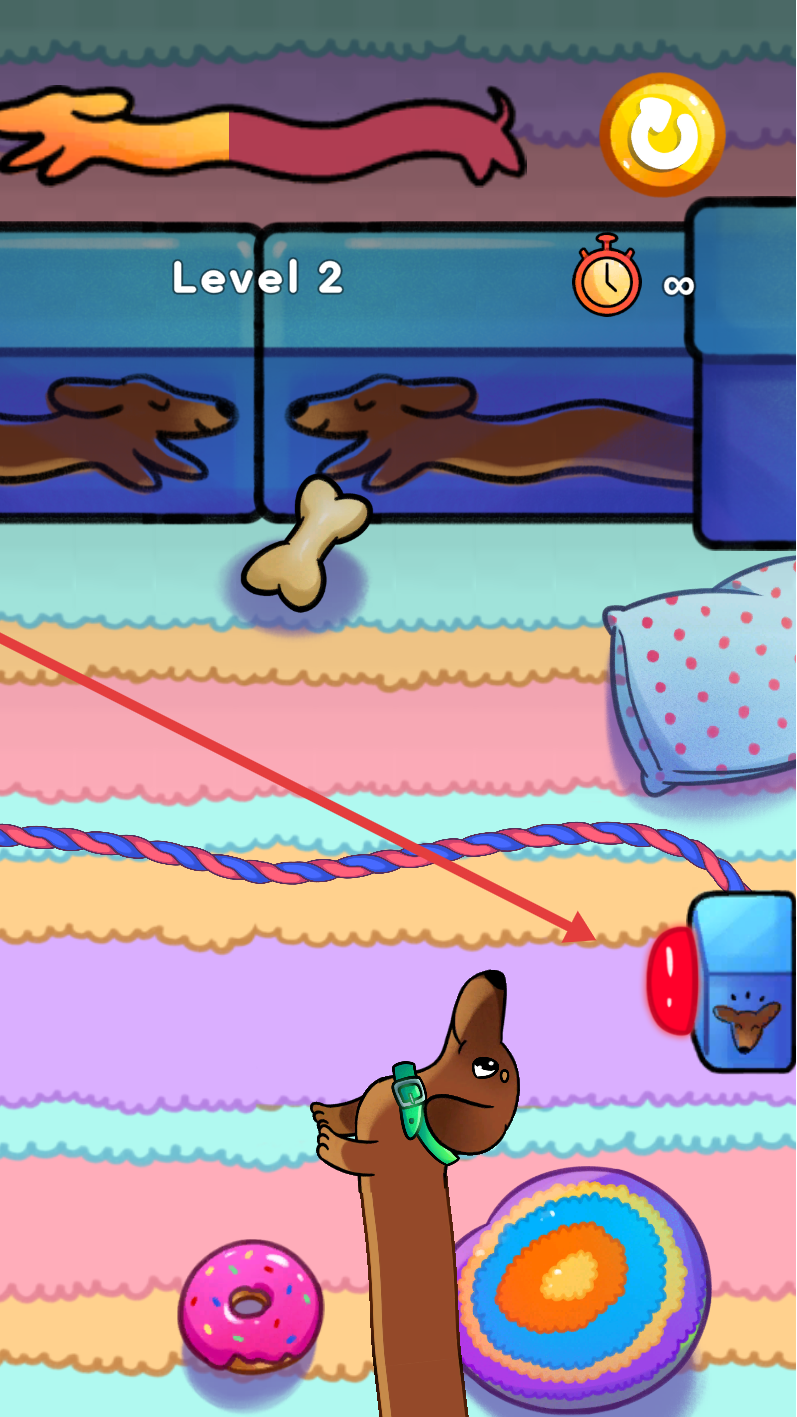 2、上方的黃條代表著小狗剩余的身體長(zhǎng)度,使小狗伸長(zhǎng)身體,抓取骨頭香腸等高處置物,推進(jìn)進(jìn)度。