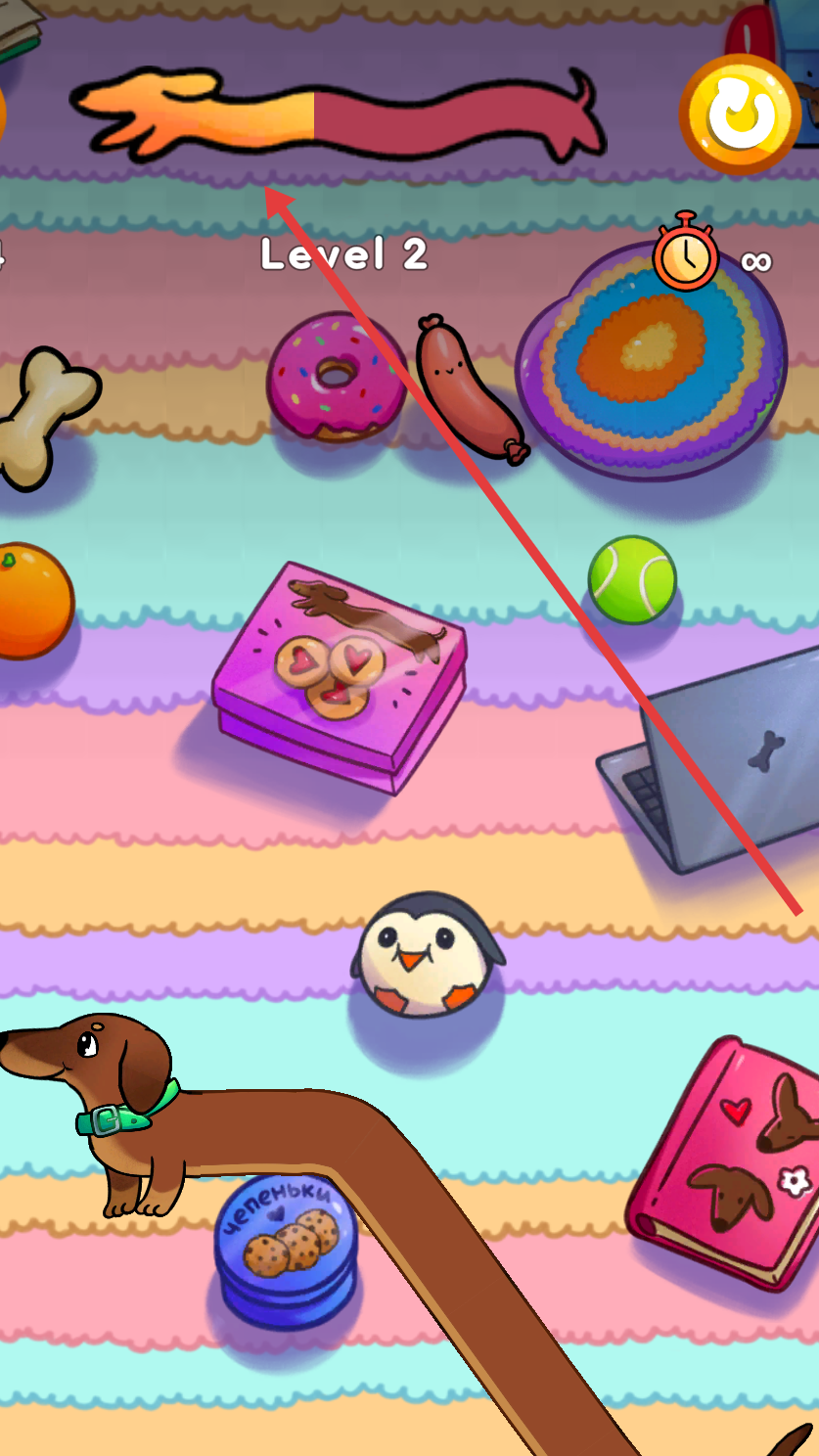 1、角色與機(jī)制緊密結(jié)合:每一次成功進(jìn)食都能看到長(zhǎng)度增長(zhǎng),這種直觀的反饋?zhàn)屝蓍e體驗(yàn)更具目標(biāo)感,同時(shí)角色設(shè)定可愛(ài),容易讓玩家產(chǎn)生好感,愿意持續(xù)引導(dǎo)小狗進(jìn)食。