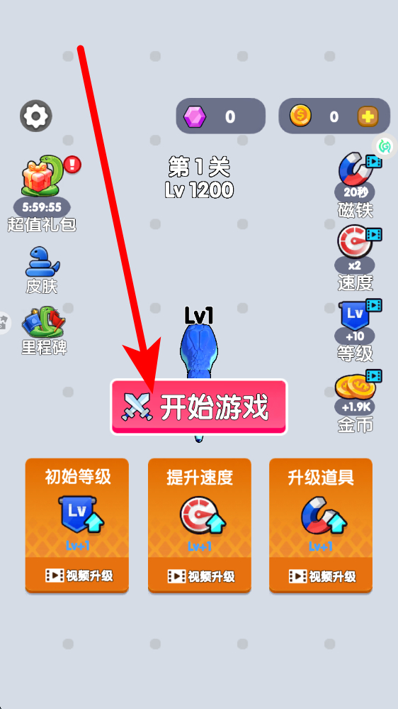 1、進入應用,在初始界面點擊開始游戲,彈出模式選擇,優(yōu)先選限時模式,其Boss等級明確,點擊進入,開啟首場蛇蛇戰(zhàn)斗,熟悉基礎玩法。