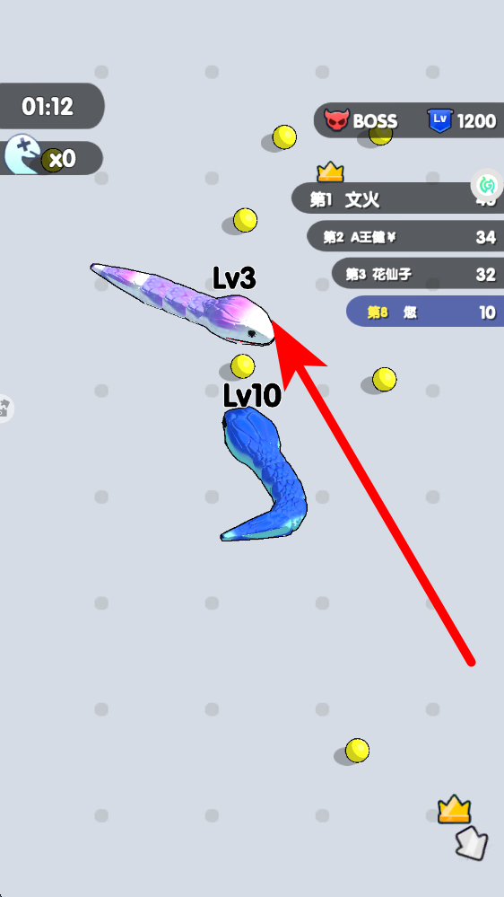 2、戰(zhàn)斗中,操控蛇蛇移動,吞食場景黃色圓球,提升等級,遭遇其他蛇蛇時,利用等級優(yōu)勢撞擊,擊敗對手獲取成長資源,壯大自身。
