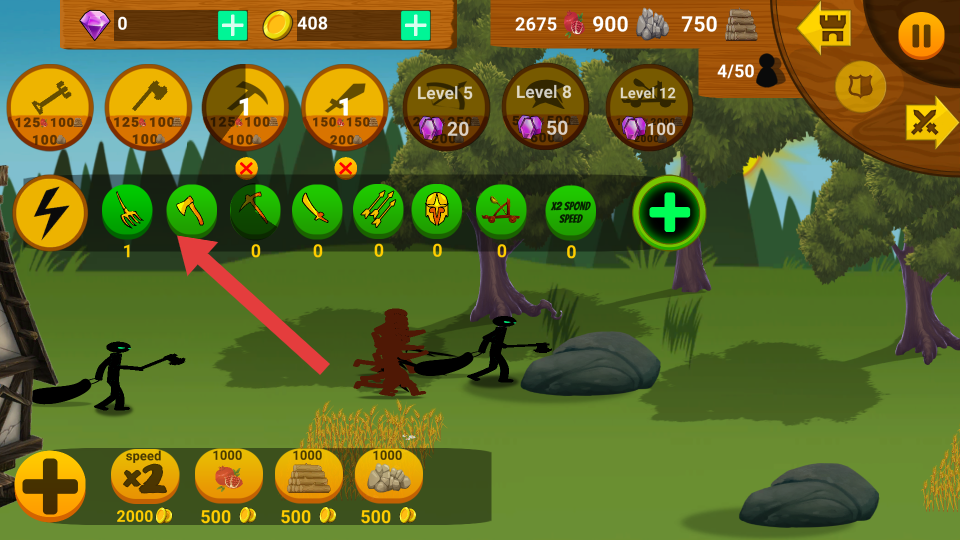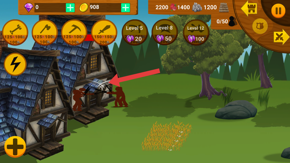 1、游戲開局可消耗資源解鎖上方工具圖標(biāo)如鑰匙、斧頭、鎬子等,助力火柴人進(jìn)行建筑、戰(zhàn)斗等操作,推進(jìn)前期發(fā)展。