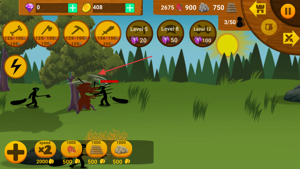 3、遇到敵方單位時(shí),操控己方火柴人主動(dòng)攻擊,可借助speed ×2等道具提升速度,結(jié)合環(huán)境擊敗敵人獲取資源。