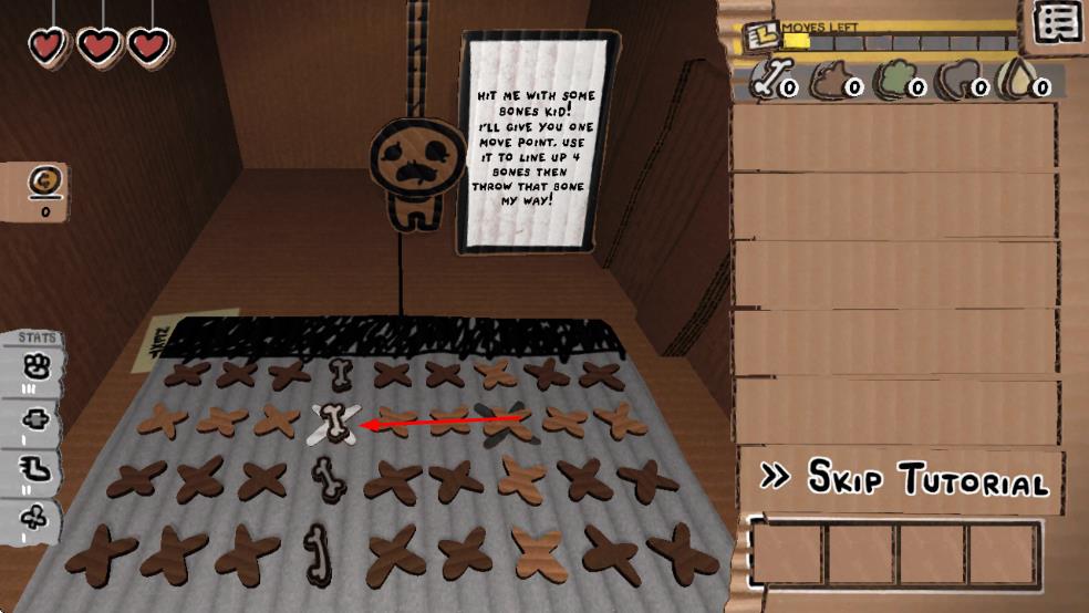 1、在布滿圖案的區(qū)域,移動(dòng)骨頭等元素,將4個(gè)相同元素排成一行,然后向目標(biāo)投擲,完成基礎(chǔ)操作任務(wù)。