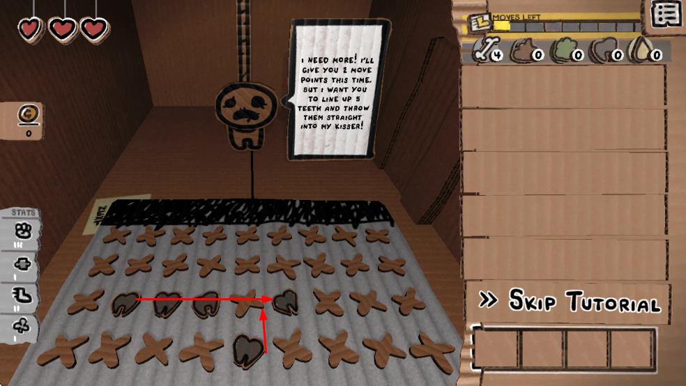 2、投擲后,目標(biāo)會(huì)有相應(yīng)反應(yīng),同時(shí)可獲得更多移動(dòng)點(diǎn)數(shù),接下來需將5個(gè)牙齒類元素排直,再次向目標(biāo)投擲。