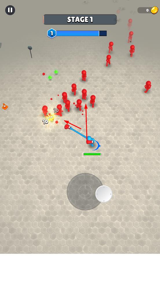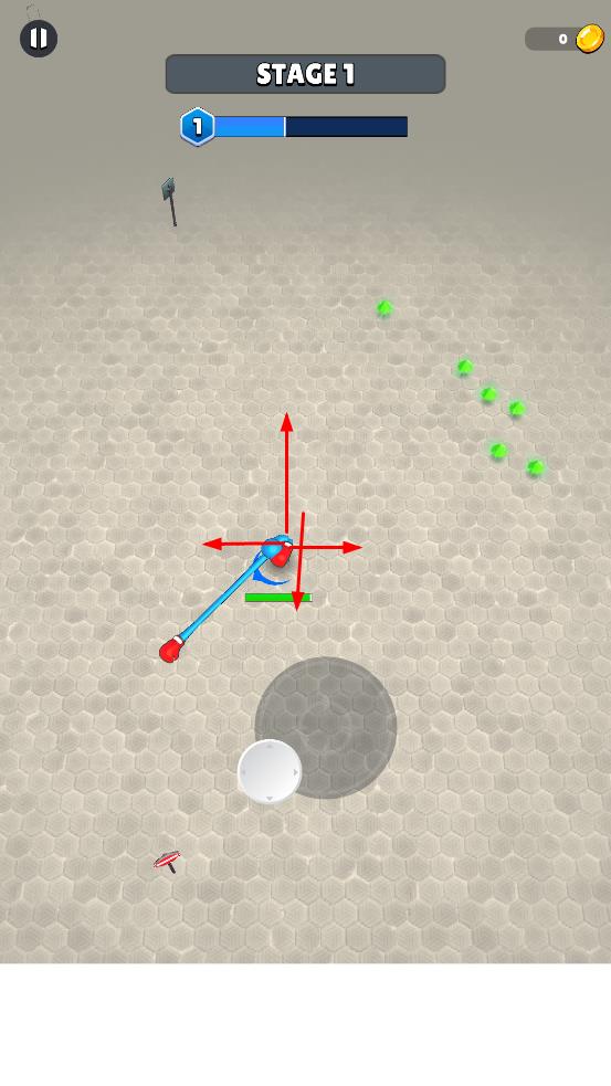 1、進(jìn)入STAGE1后,操控角色移動,在場景中收集綠色道具,為戰(zhàn)斗和升級做好準(zhǔn)備,開啟闖關(guān)之旅。