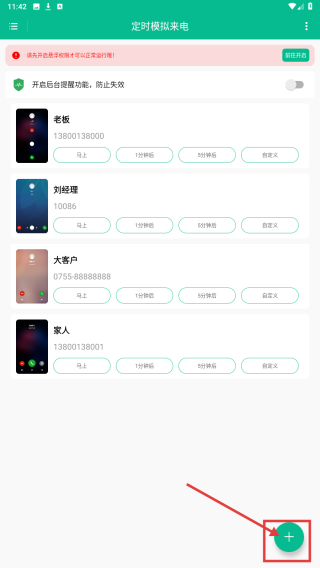 1、打開(kāi)定時(shí)模擬來(lái)電應(yīng)用,點(diǎn)擊界面右下角的+按鈕,進(jìn)入新建模擬來(lái)電頁(yè)面。