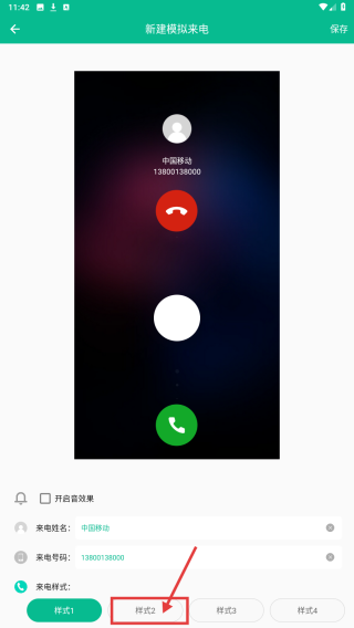 2、在新建模擬來(lái)電頁(yè)面,選擇樣式2選項(xiàng),設(shè)置來(lái)電相關(guān)樣式。